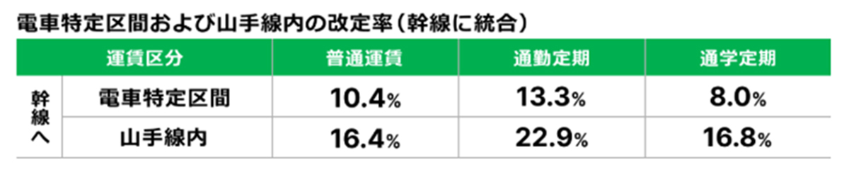 「電車特定区間・山手線内」は「幹線」に統合するため運賃を改定