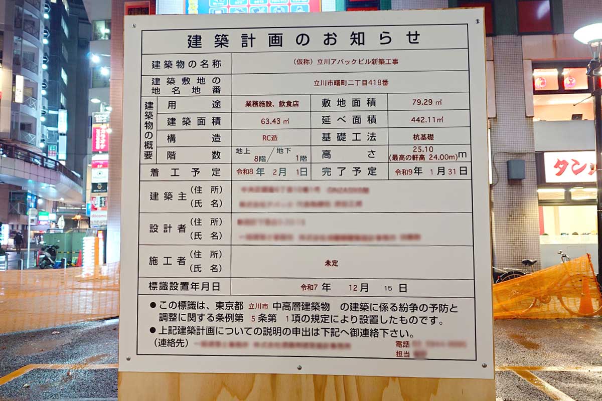 地上8階のノッポビル!?立川駅北口・ピタゴラス通りぞいに新しくビルが建つみたい。2027年1月完成予定