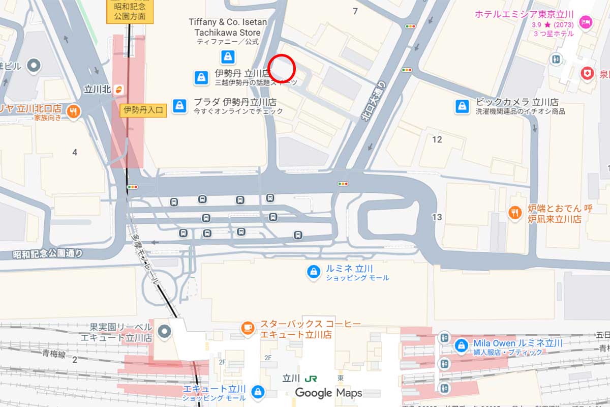 『伊勢丹立川店』脇、近くには『日高屋 立川北口店』や『TAQUERIA Cantina』などがあります。