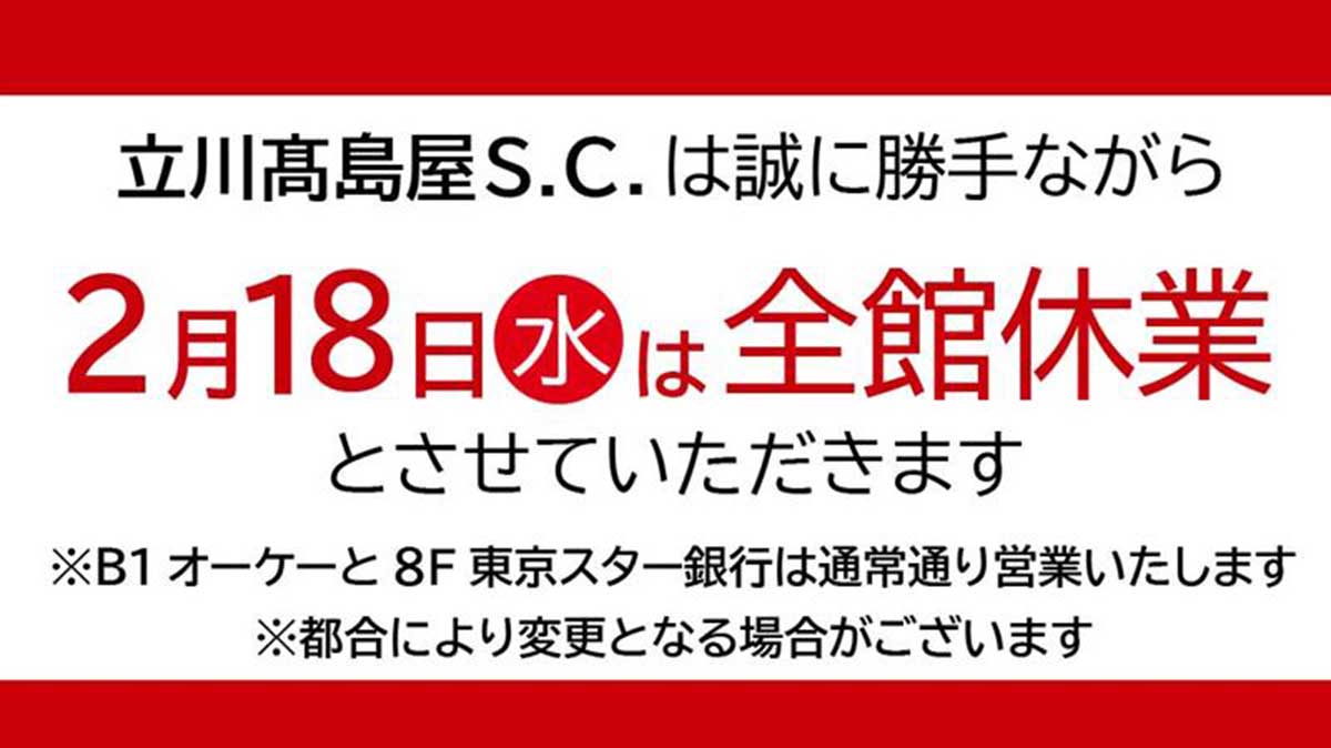 〖臨時休業〗2月18日(水)は立川高島屋S.C.の全館休業日!B1F『オーケー』と8F『東京スター銀行』は通常営業