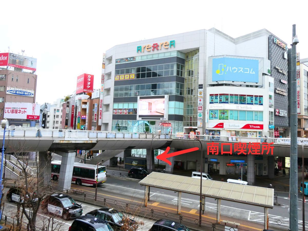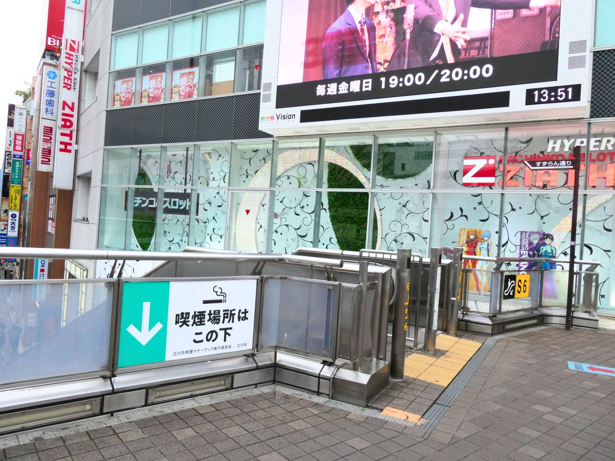『立川駅南口公衆喫煙所』は『アレアレア』の真下にあります↓