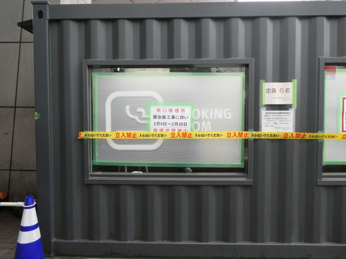 “南口喫煙所 扉改修工事に伴い2月9日~2月20日 喫煙所閉鎖中”とのこと。