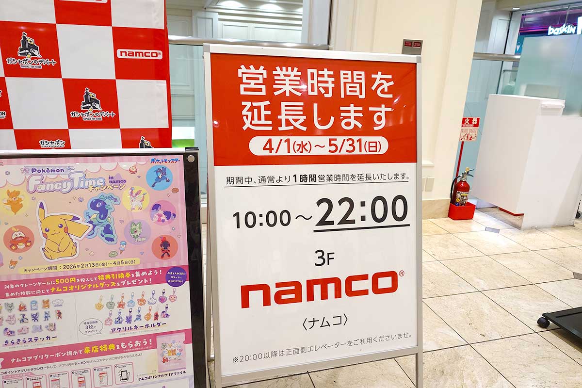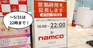 立川高島屋S.C.3Fにあるゲームセンター『namco 立川高島屋S.C.店』の営業時間が5月31日までは22時になるみたい