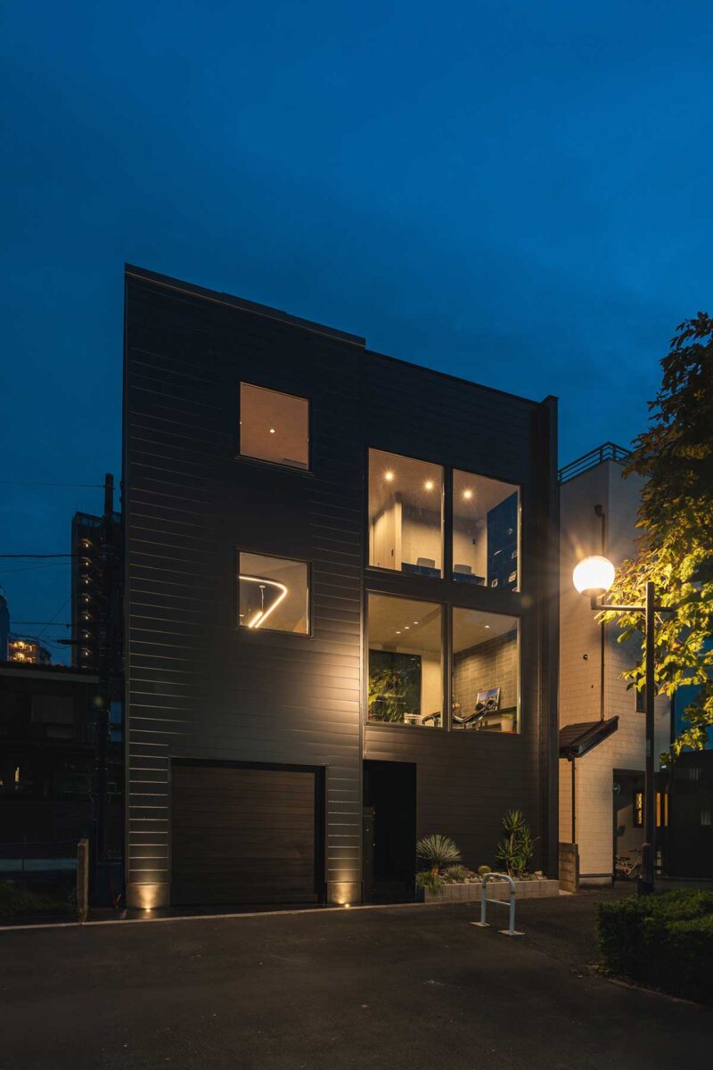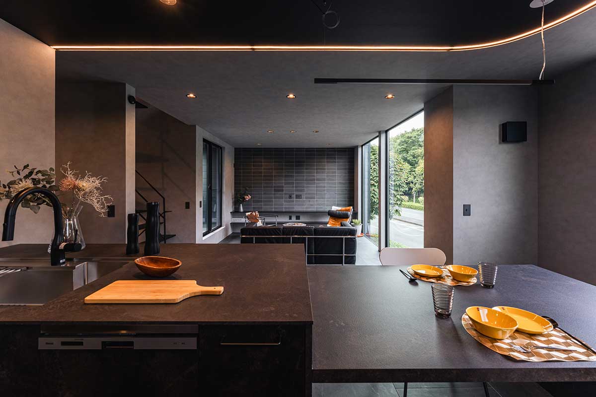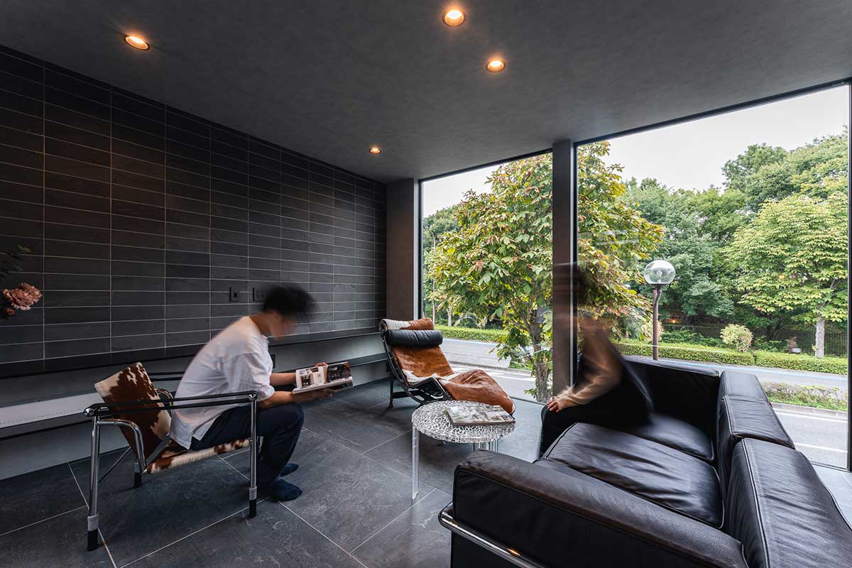 都市の通りに凛と佇む黒い外観は、まち並みに溶け込みながらも存在感を放ち、道行く人の視線を 引き寄せます。大きな窓の向こうに広がる昭和記念公園の緑は、住まいの中に四季の風景を取り込 み、日常の背景となってゆきます。この場所に完成した姿は、まさに 「街とつながる、黒い箱。」