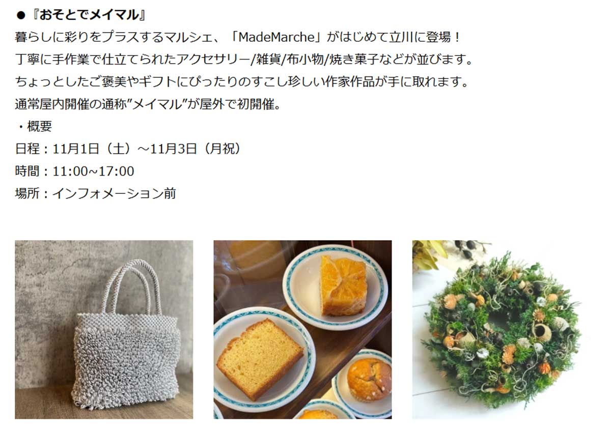 期間中はハンドメイドのアクセサリーや雑貨、焼き菓子などが買える「おそとでメイマル」が開催されます。