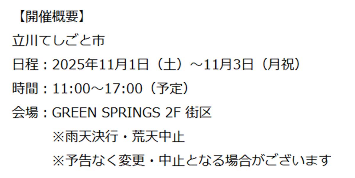 11月1日(土)~3日(月・祝)の3日間、グリーンスプリングスで「立川てしごと市」が開催されます。