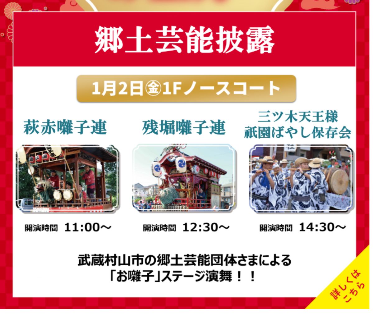 1月2日(金)に開催されるのは武蔵村山市の郷土伝統団体によるお囃子ステージ「郷土芸能披露」です。