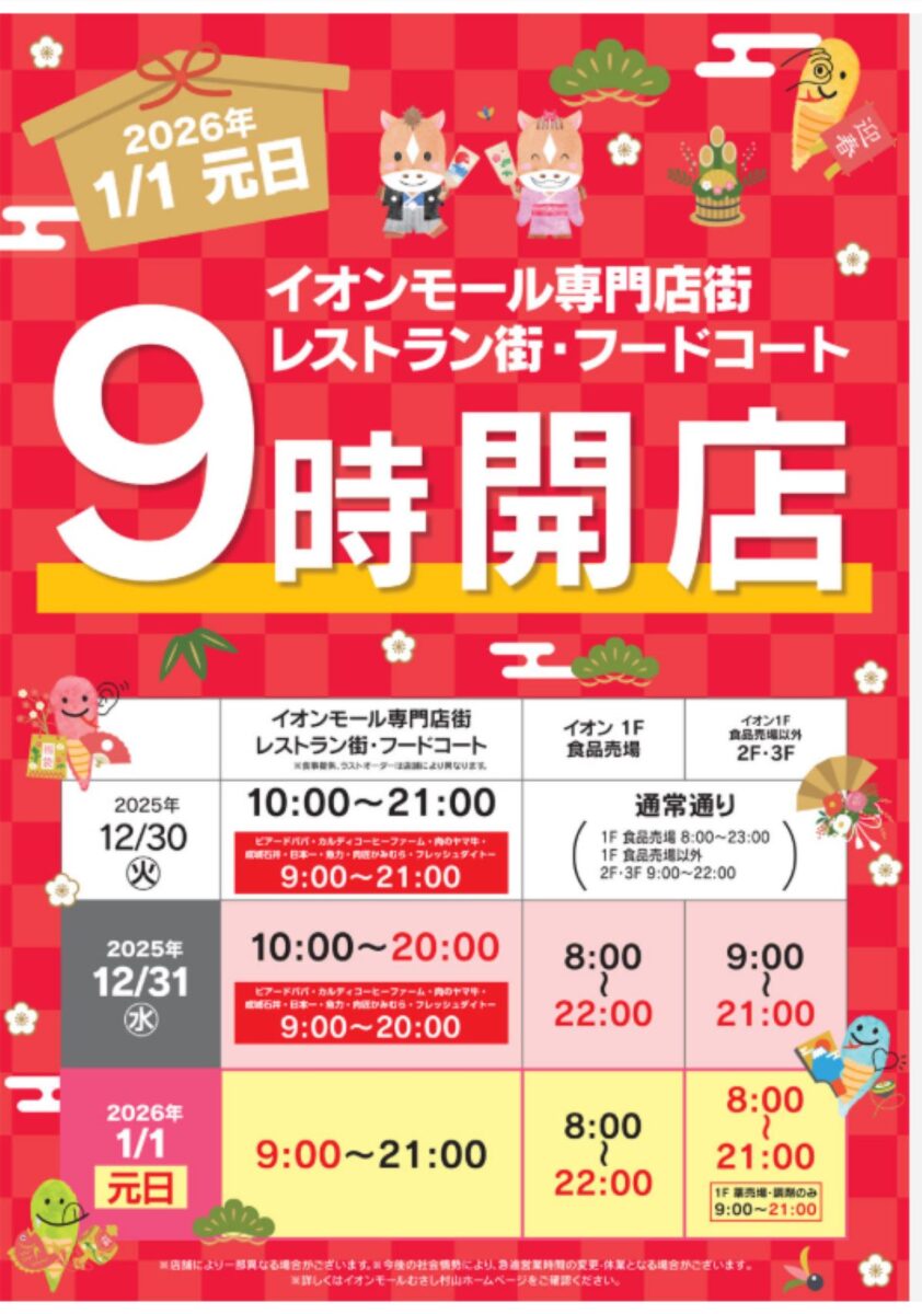 イオンモールむさし村山の年末年始の営業時間はこちら↓