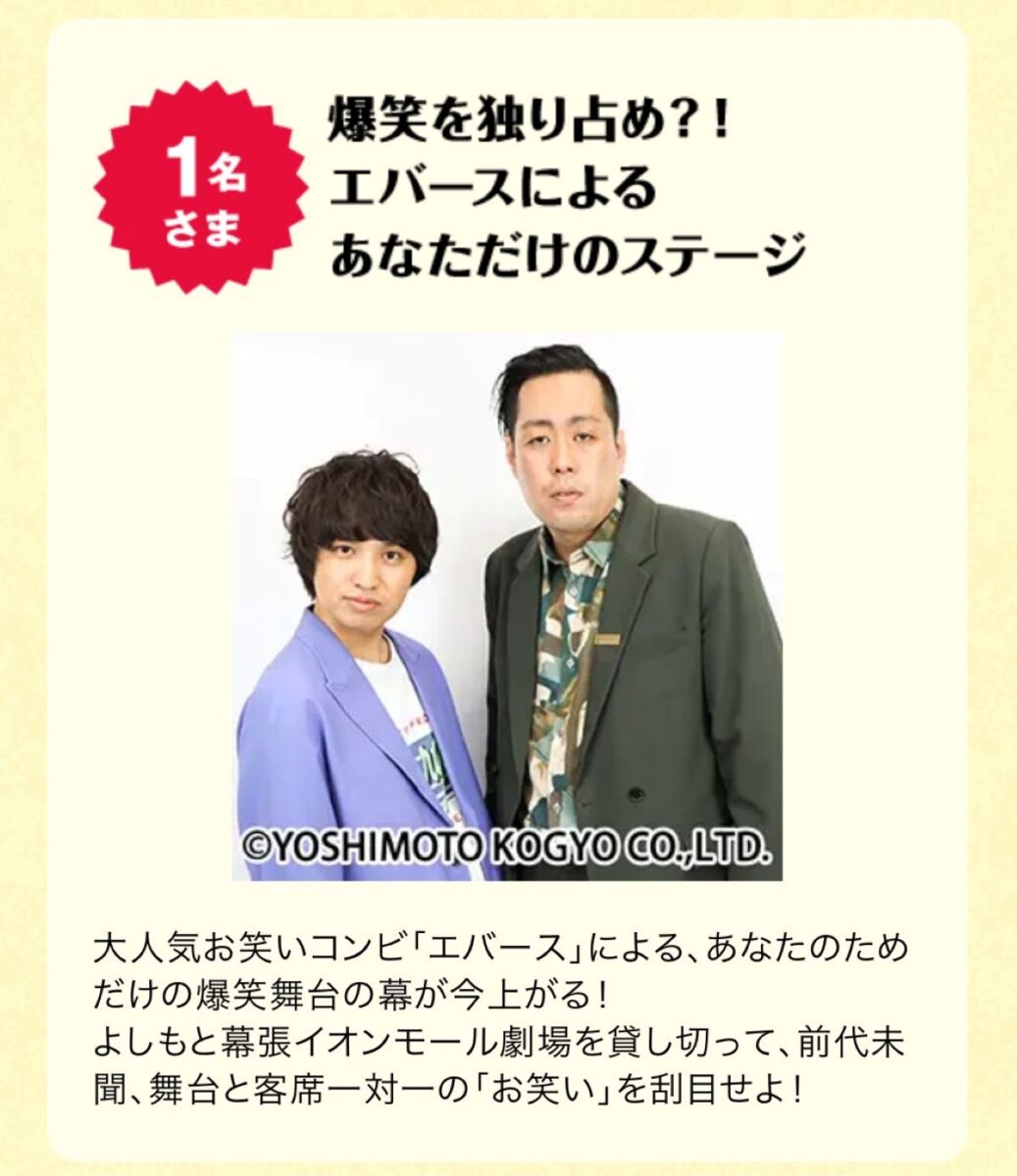 たとえばお笑いコンビのエバースさんが劇場を貸切って自分だけに漫才してくれたり↓