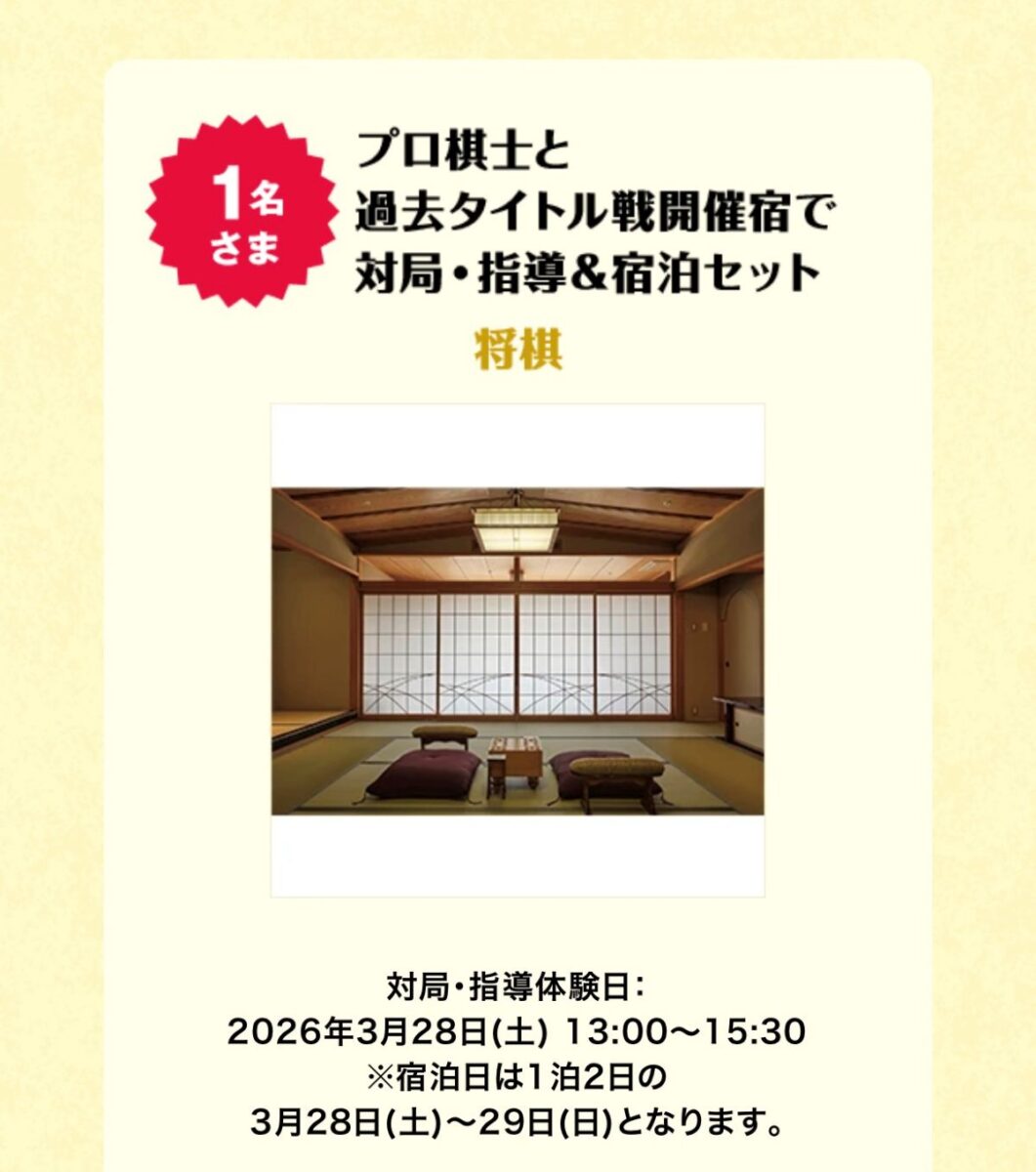 プロ棋士と実際にタイトル戦が開催された場所で対局できちゃう宿泊セットなど↓
