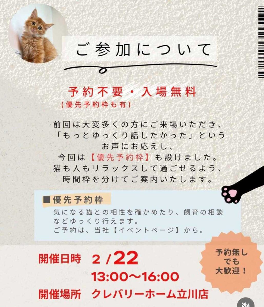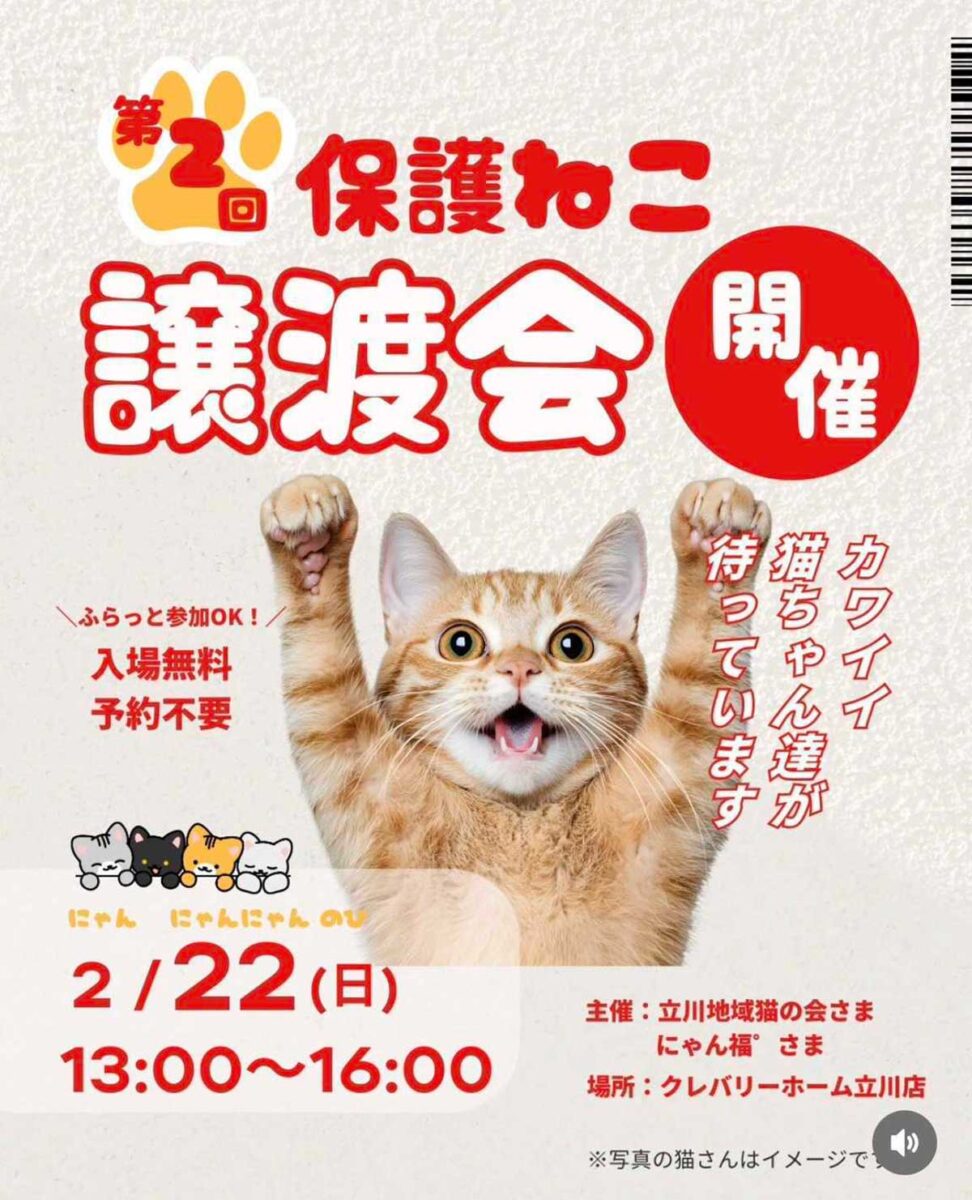 【入場無料・予約不要】にゃんにゃんにゃんの日!2月22日(日)にハウジングワールド立川内にある『クレバリーホーム 立川店』で保護ねこ譲渡会が開催されるみたい