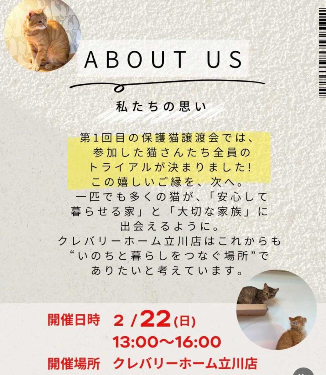 ハウジングワールド立川内にある『クレバリーホーム 立川店』保護ねこ譲渡会が開催されるようです。