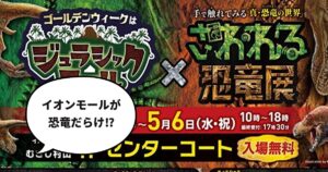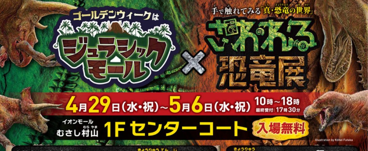 【入場無料】ゴールデンウィークは恐竜だらけ!イオンモールむさし村山で4月29日(水・祝)~5月6日(水・祝)に「ジュラシックモール×さわれる恐竜展」ってイベントが開催