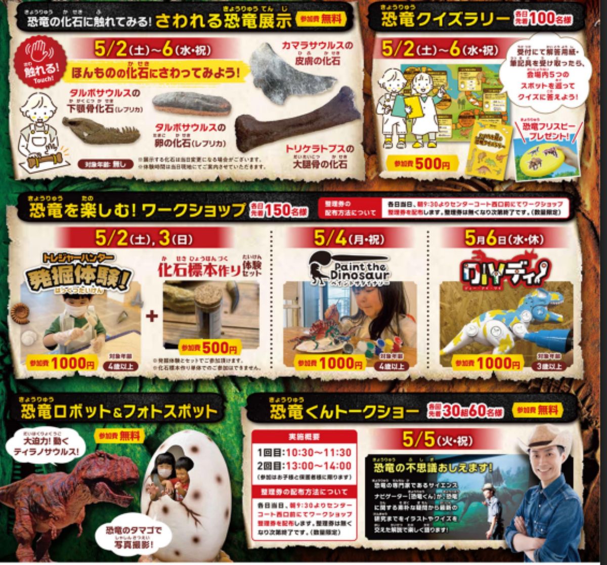 ゴールデンウィーク中の8日間、イオンモールむさし村山館内で恐竜にちなんだ色んな体験ができるみたい。