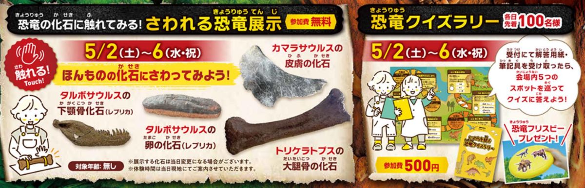「恐竜の化石に触れてみる!さわれる恐竜展示」と「恐竜クイズラリー」です。