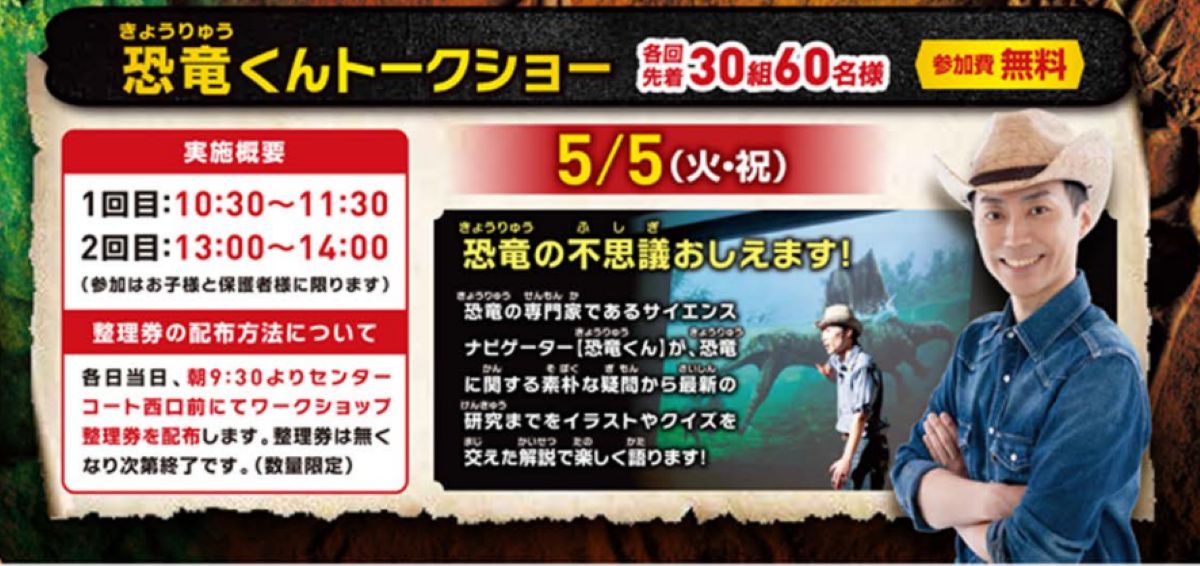 5月5日(火・祝)は恐竜の専門家、サイエンスアドバイザーの「恐竜くんトークショー」を開催。