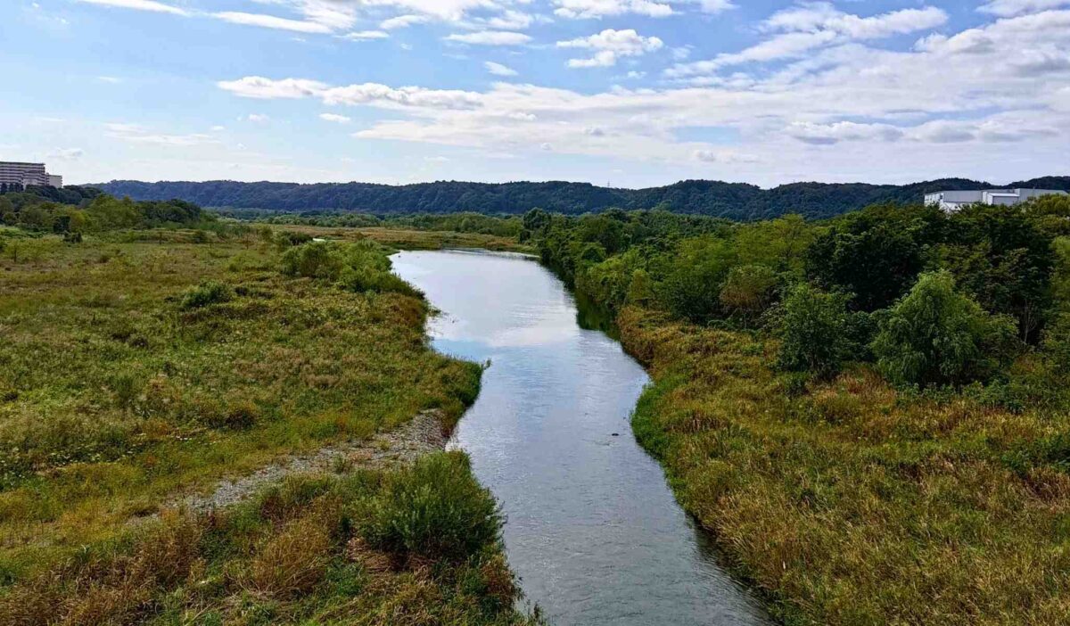 水の流れは穏やかで、釣りを楽しんでいる人や犬に水遊びをさせている人もいました。