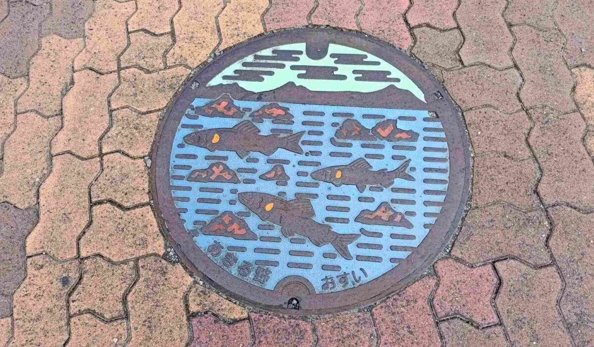 あきる野市のマンホールは、秋川の夏の風物詩・アユのデザインです↓