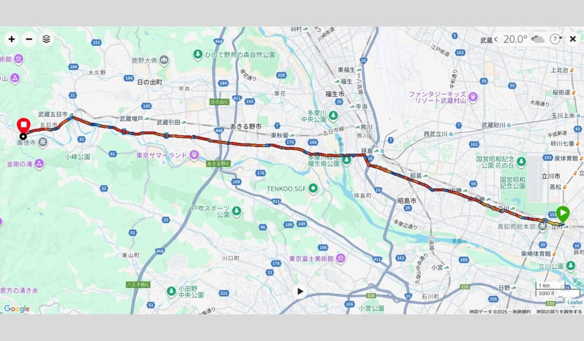 今回走ったコースはこんな感じ。立川からの距離は20kmでした↓