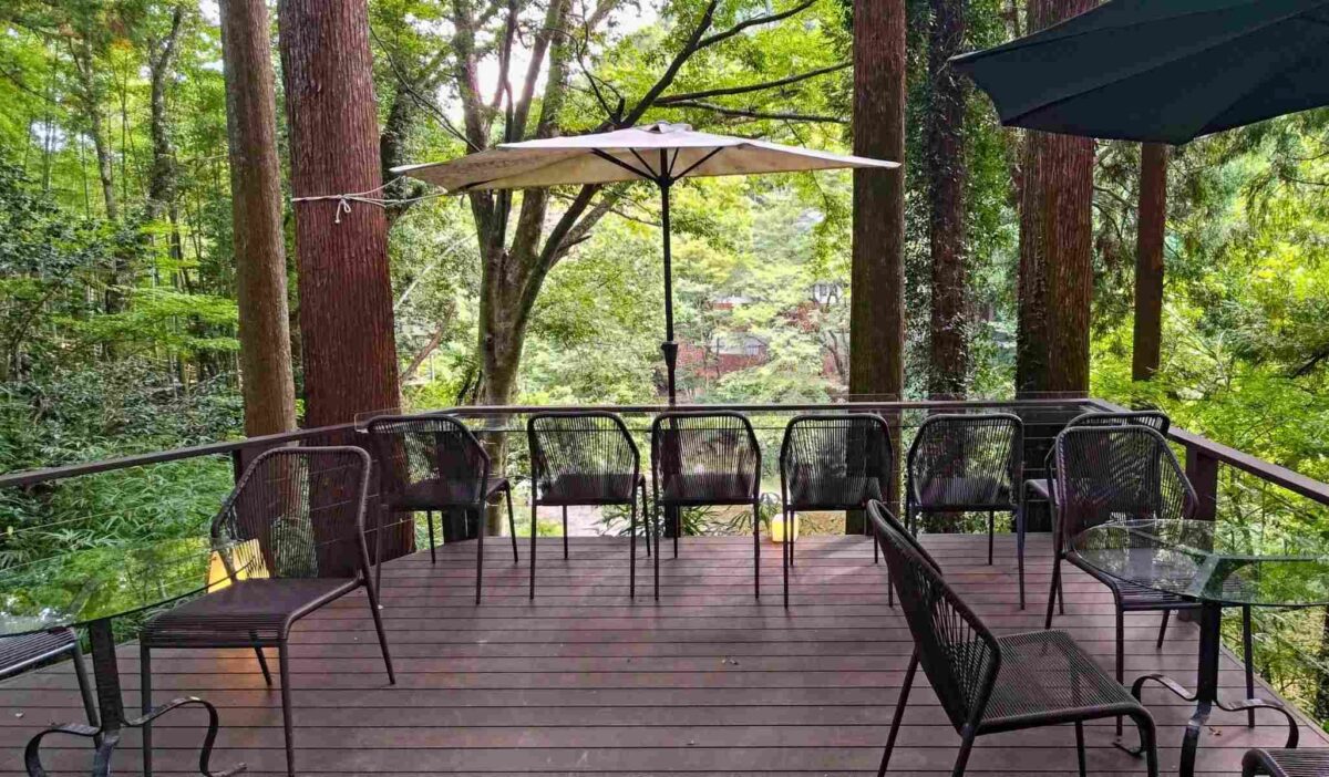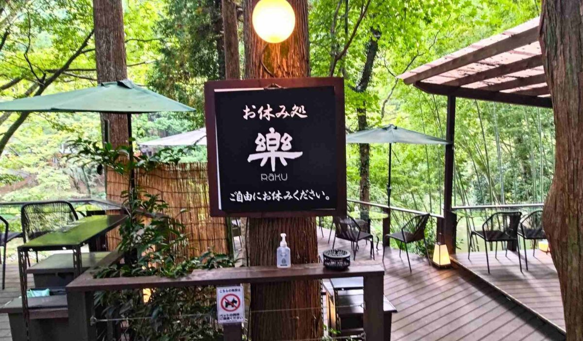 『楽(らく)』は木々に囲まれたウッドデッキで、まるで森の中にお邪魔しているような感覚に。