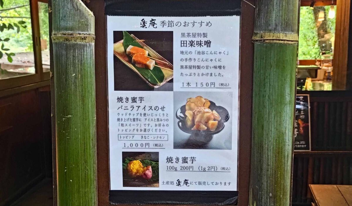 水車近くの『季節のお店 楽庵』では、田楽味噌やお芋系スイーツを売っていました↓