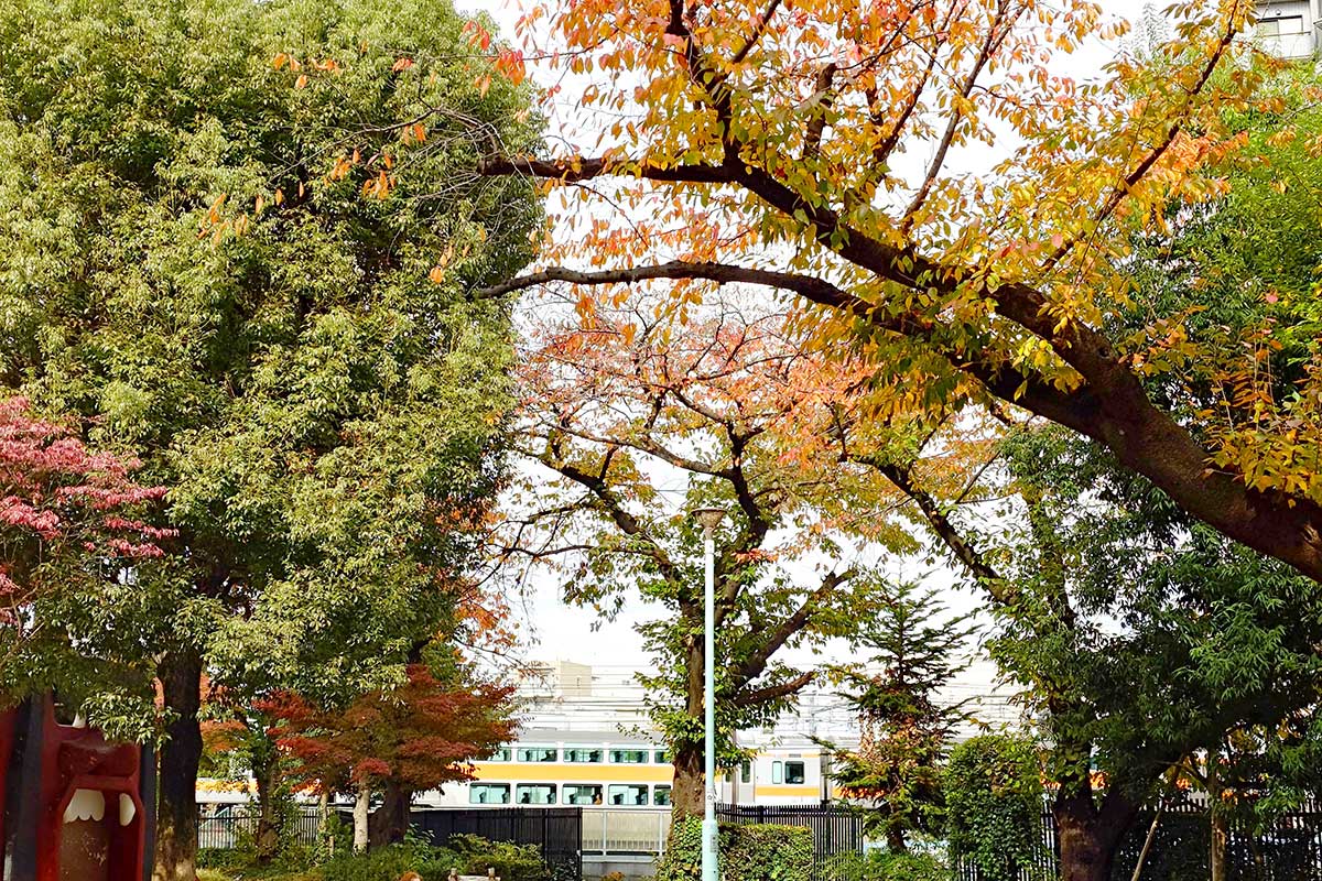 紅葉だけでなく黄葉もあります。南武線との黄色ショット。