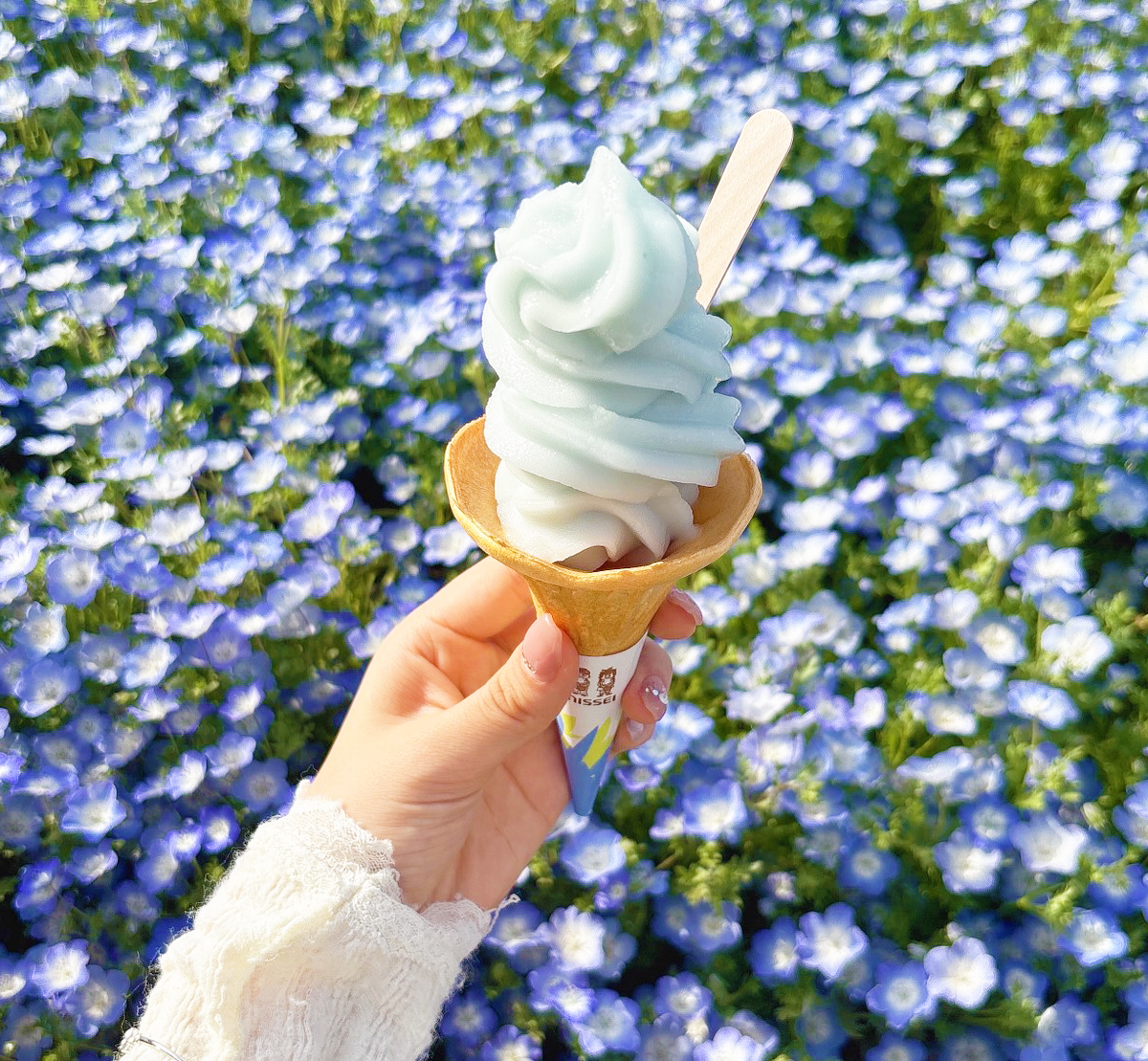 木陰に座って、ネモフィラをみながら食べるネモフィラソフトクリームは至高。